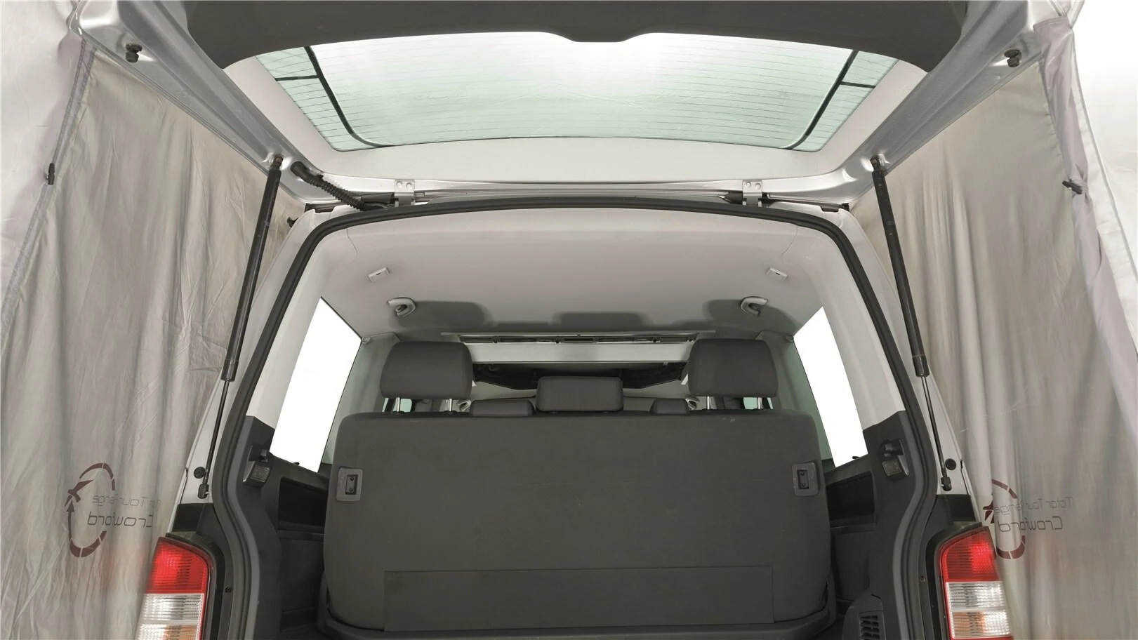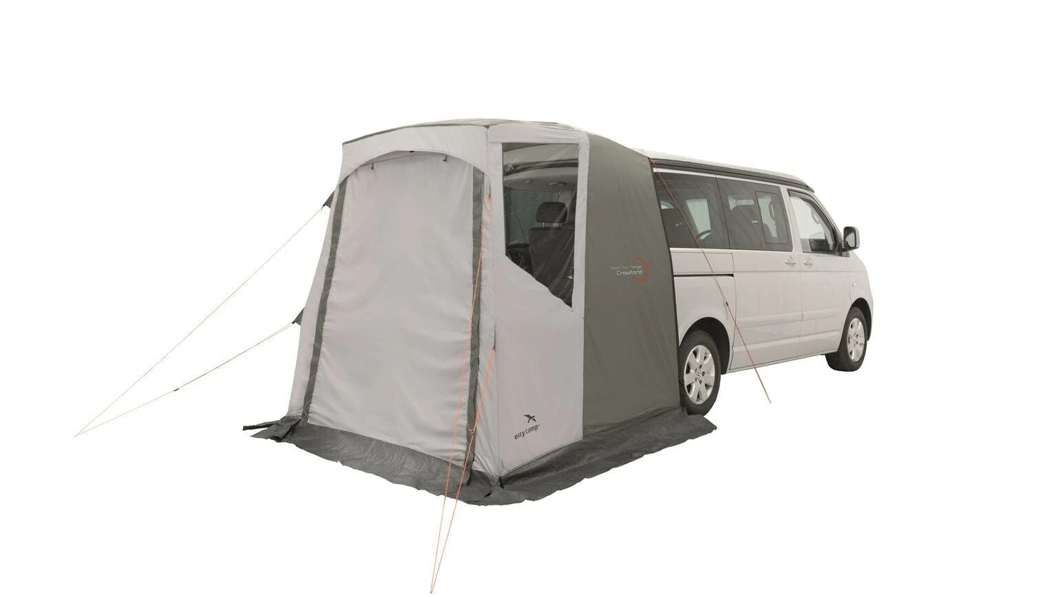 A tailgate-mounted, fixed camper van awning designed for both short term-camping trips, and day trips out in the van. The purpose of the Crowford is to provide a small pack size and as such it is lightweight (weighs just 3.9kg) , and can be stored inside the van, and quickly assembled once at the campsite or final destination, to provide some flexible living space and shelter to the vehicle. Additionally, the front door of the Crowford can be rolled up to create a large entry point, which can also be pitched out as a canopy using the additional poles provided. Further to this, the design allows you to close the tailgate and lock your vehicle while the it is attached to the vehicle, so you can leave it pitched and keep any valuables secure whilst away from the vehicle. Perfect for those with constricted space, as the Crowford has a small pack size, and low weight.