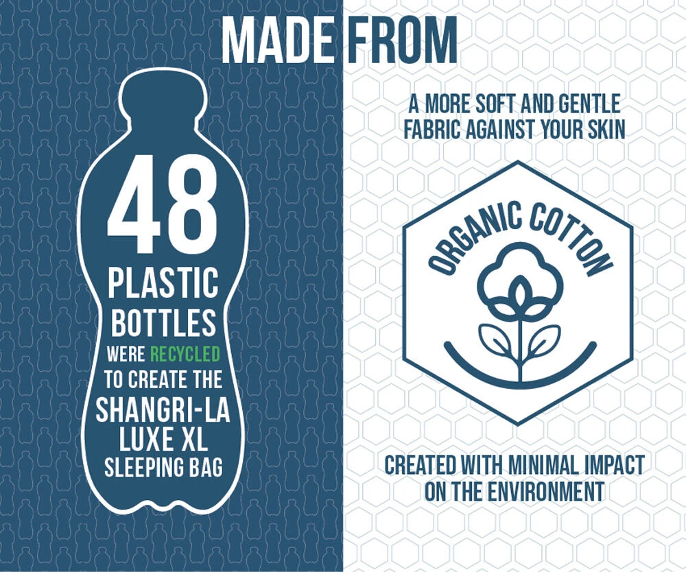 The Vango Shangri-La Luxe XL sleeping bag is new for 2023, and perfectly compliments the Shangri-La self-inflating mats. Square in shape for those that like to feel less restricted or move more during the night and an integrated headrest enhances the comfort. Not only is it warm and cosy, but it has also been made from 100% recycled polyester and organic cotton making it a more sustainable choice. Up to 48 plastic bottles were recycled to create the Luxe XL bag – the lining is made from cotton it is beautifully soft on your skin and hypo-allergenic.